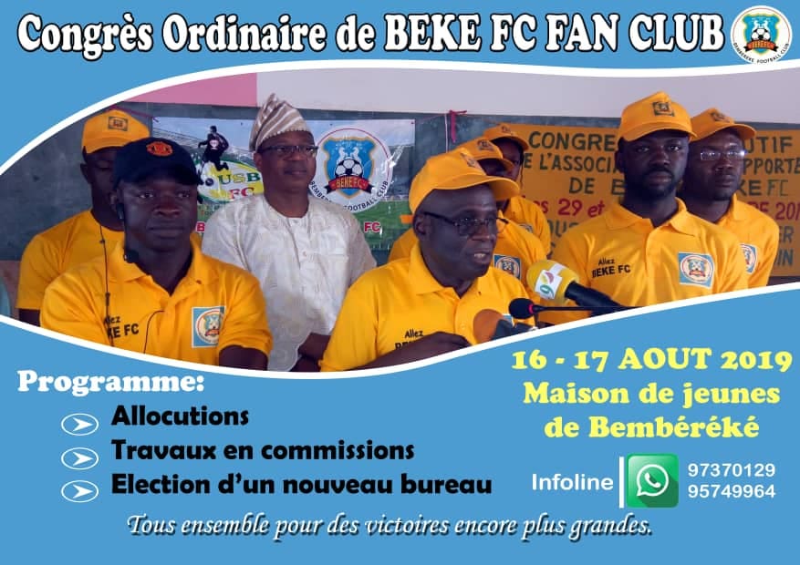 Portée sur les fonts baptismaux il y de cela deux ans et plus précisément le 30 septembre 2017, l’association des supporters (Béké Fans Club) du club-phare de la commune de Bembèrèkè organise les 16 et 17 Août 2019, à la maison des jeunes de ladite commune de son tout premier congrès ordinaire. Conduit depuis sa création par un bureau provisoire composer de onze membres et présider par Robert Orou Yorouba, Béké Fans Club entend faire lors de ce congrès, le bilan des activités menées par ledit bureau, jeter les bases devant régir le fonctionnement de l’association et surtout procéder à l’élection et l’installation du tout premier bureau exécutif. A cette même occasion, ils vont aussi, non seulement, dresser le bilan sportif de la saison écoulé mais aussi définir clairement leurs objectifs et attentes vis-à-vis du club.