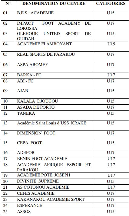FOOTBALL/BÉNIN: Tournoi des Centres de Formation 2019: Liste officielle des pépinières participantes