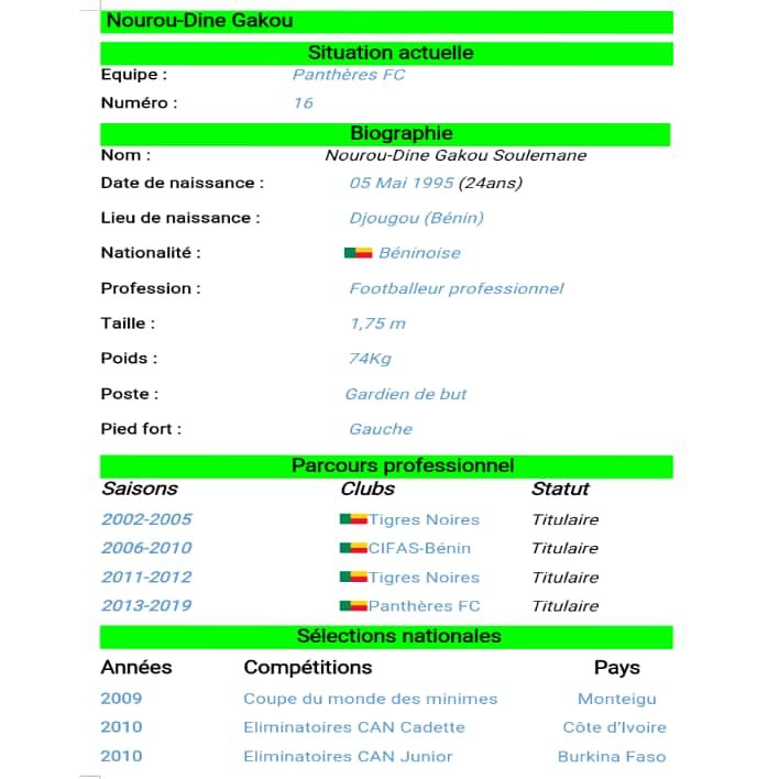 Né le 05 mai 1995 à Djougou, Nourou-Dine Gakou Soulemane est un footballeur professionnel évoluant au poste de gardien de but avec les Panthères FC de Djougou en première Division béninoise. Il s’essayait au cuir rond au plus bas âge (environs 5ans) dans sa ville natale. Il a intégré en 2002 le groupe des Tigres Noirs de Djougou, un club de la division régionale en tant qu’attaquant excentré gauche. Talentueux et convainquant à son poste, il fut repêché par un centre de formation Sport-étude dénommé CIFAS-Bénin qui évolue en championnat national amateur.